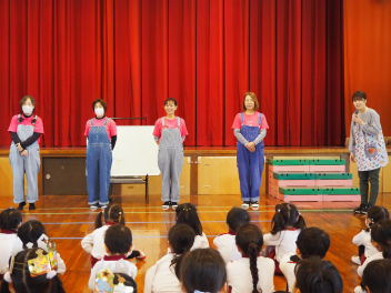 次はあお組さんの「さるかに合戦」です。きい組さんに衣装の着方を、優しく教える姿が見られました。
