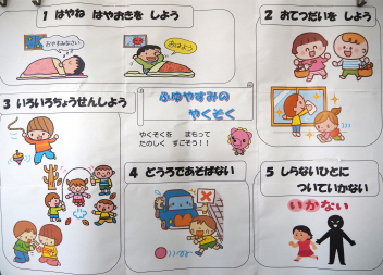 スモーク体験の後、火災の避難訓練を行いました。消防士さんからは火災の時の約束「おはしも」の話を聞きました。