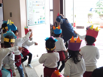 「ドンドンドンドン…」大きな音がして、あかぐみの部屋に「きいぐみオニ」がやってきました