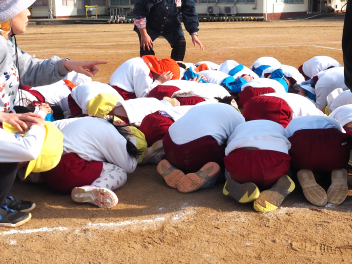 近くにいる先生の話を聞いて、園庭の真ん中に避難してきた子供たち。ダンゴムシのポーズで自分の身を守っていました。