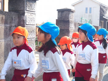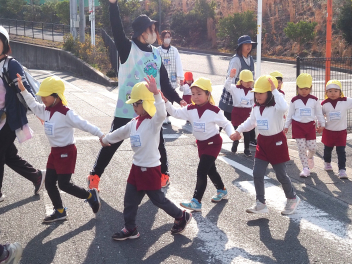 小学校の坂を上り、一生懸命に歩いて避難しました。避難開始から12分で小学校に到着することができました。あかぐみさんは、あおぐみさんの「なかよしペア」の子が手をつないでくれたので、安心して避難をすることができました。